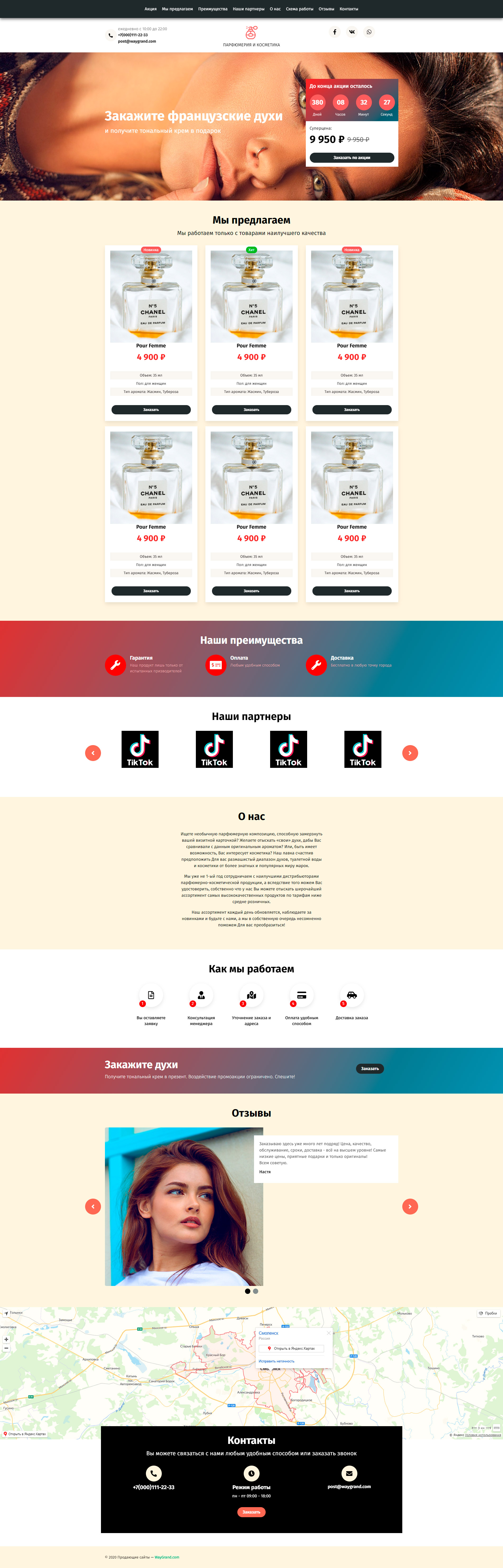 - Промоблок "Закажите французские духи" с кнопкой призыва к действию "Заказать по акции"