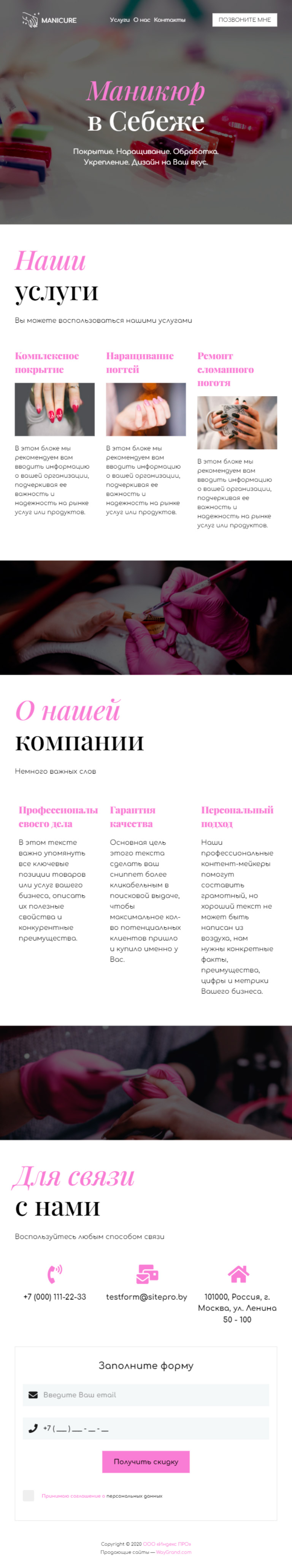 Закажите готовый продающий сайт визитка #1107102 в Липецке за 5-7 дня «под ключ»: свёрстан, отрисован и готов к рекламе. Тематика шаблона «Маникюр в Себеже».