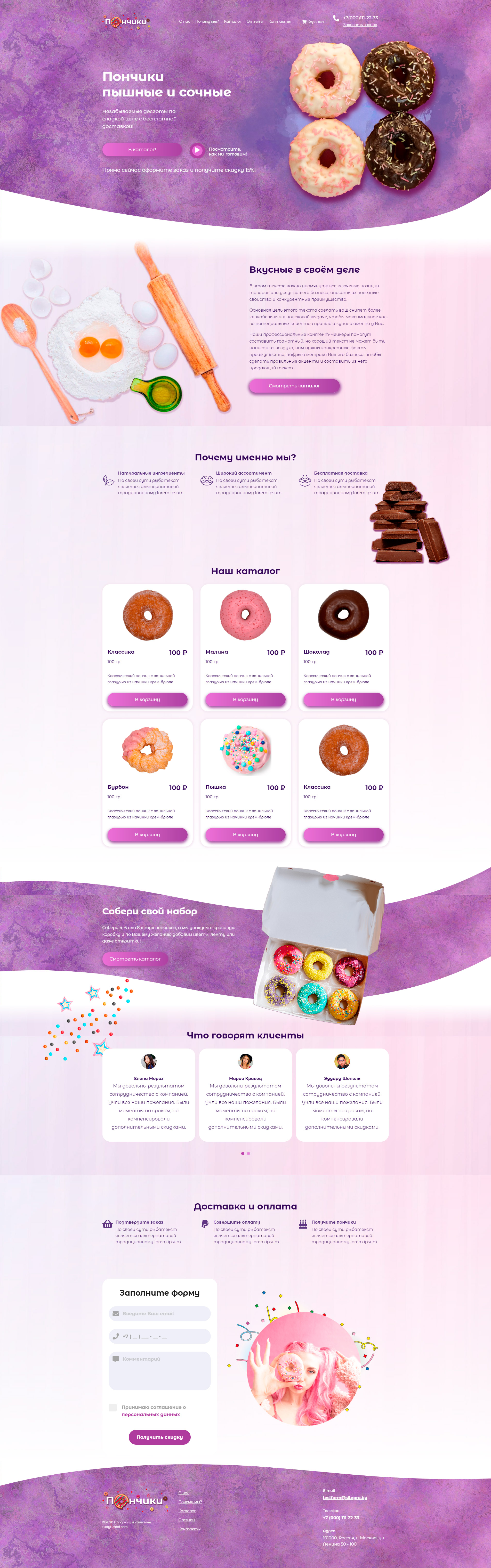 Закажите готовый продающий сайт лендинг #1739202 в Липецке за 1-3 дня «под ключ»: свёрстан, отрисован и готов к рекламе. Тематика шаблона «Пончики».