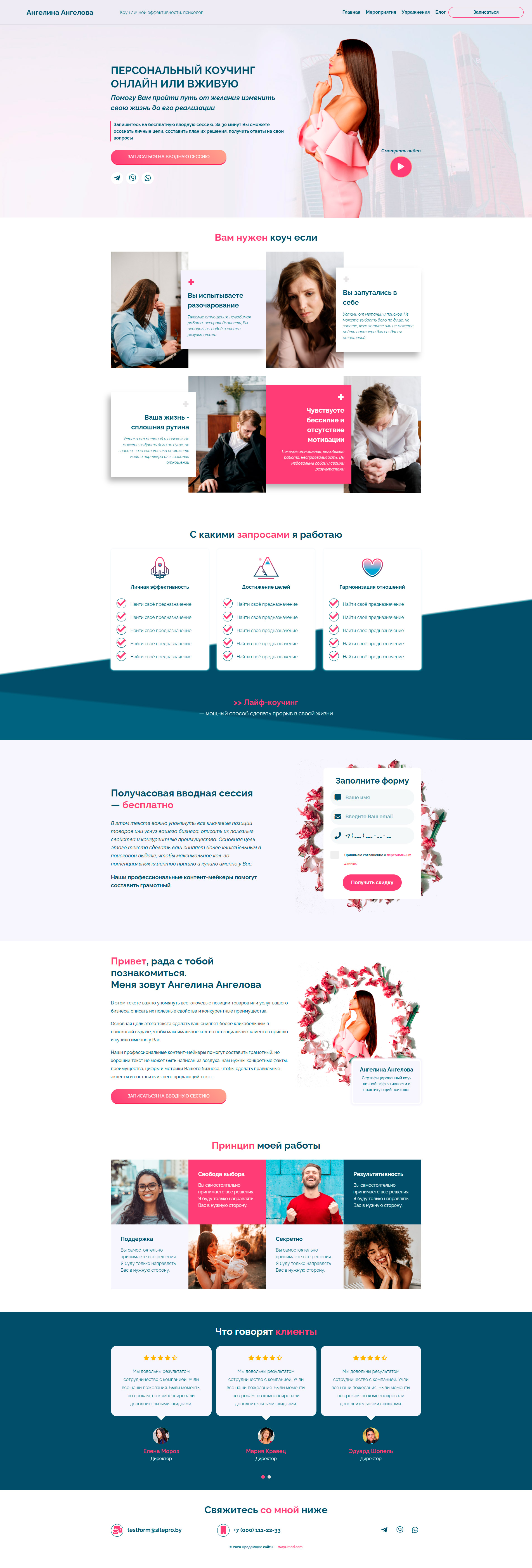 - Промоблок "Персональный коучинг" с кнопкой призыва к действию "Записаться на вводную сессию"