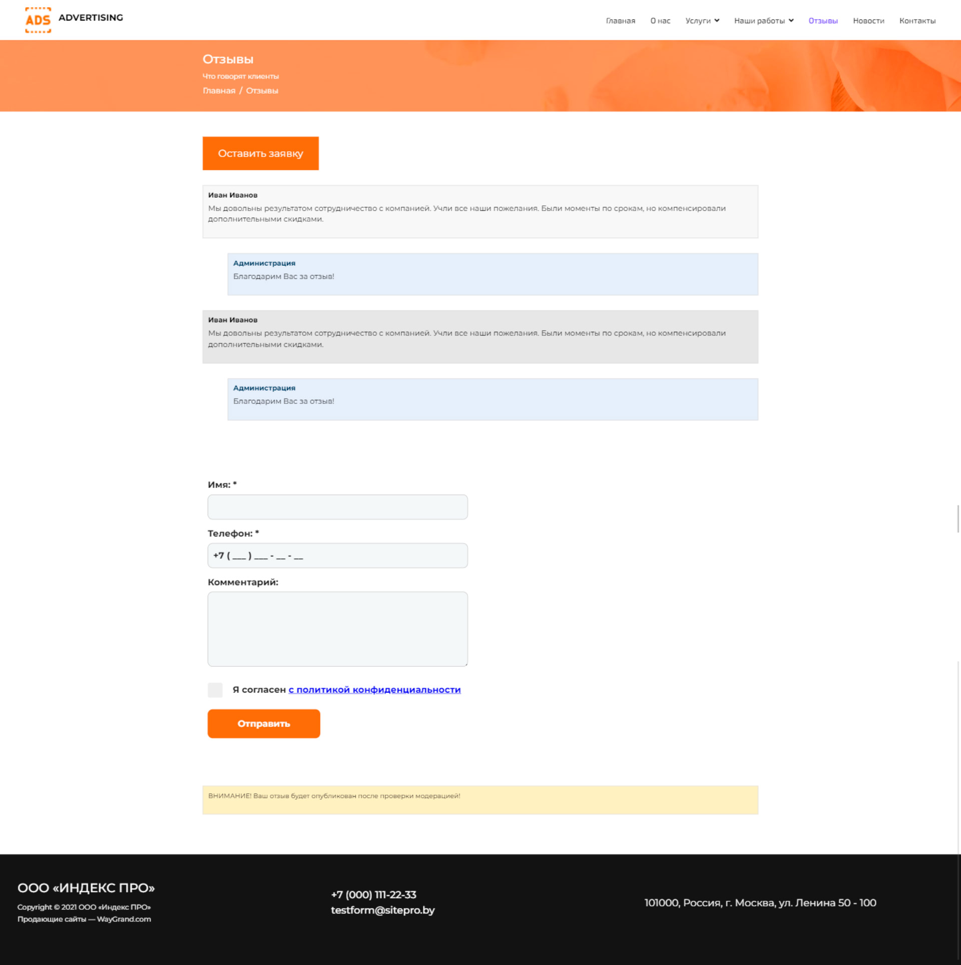 - Страница "Отзывы"